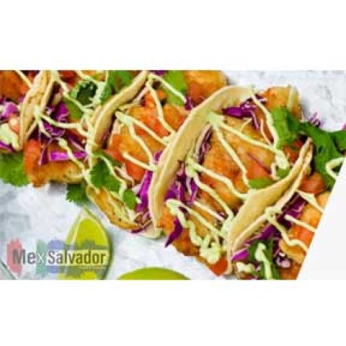 Lightly fried beer battered fish tacos, Topped with lime julienne red cabbage salad and avocado crema sauce.