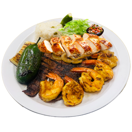 Grilled Shrimp, chicken, and marinated steak with rice, pico de gallo, and a side salad.